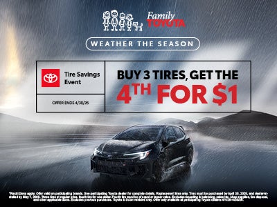 Restrictions apply. Offer valid on participating brands. See participating Toyota dealer for complete details. Replacement tires only. Tires must be purchased by April 30, 2026, and dealer-installed by May 7, 2026. Three tires at regular price, fourth tire for one dollar. Fourth tire must be of equal or lesser value. Excludes mounting & balancing, sales tax, shop supplies, tire disposal, and other applicable taxes. Excludes previous purchases. Toyota & Scion vehicles only. Offer only available at participating Toyota dealers 4/1/26–4/30/26.